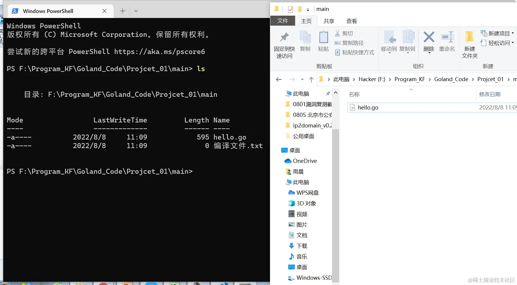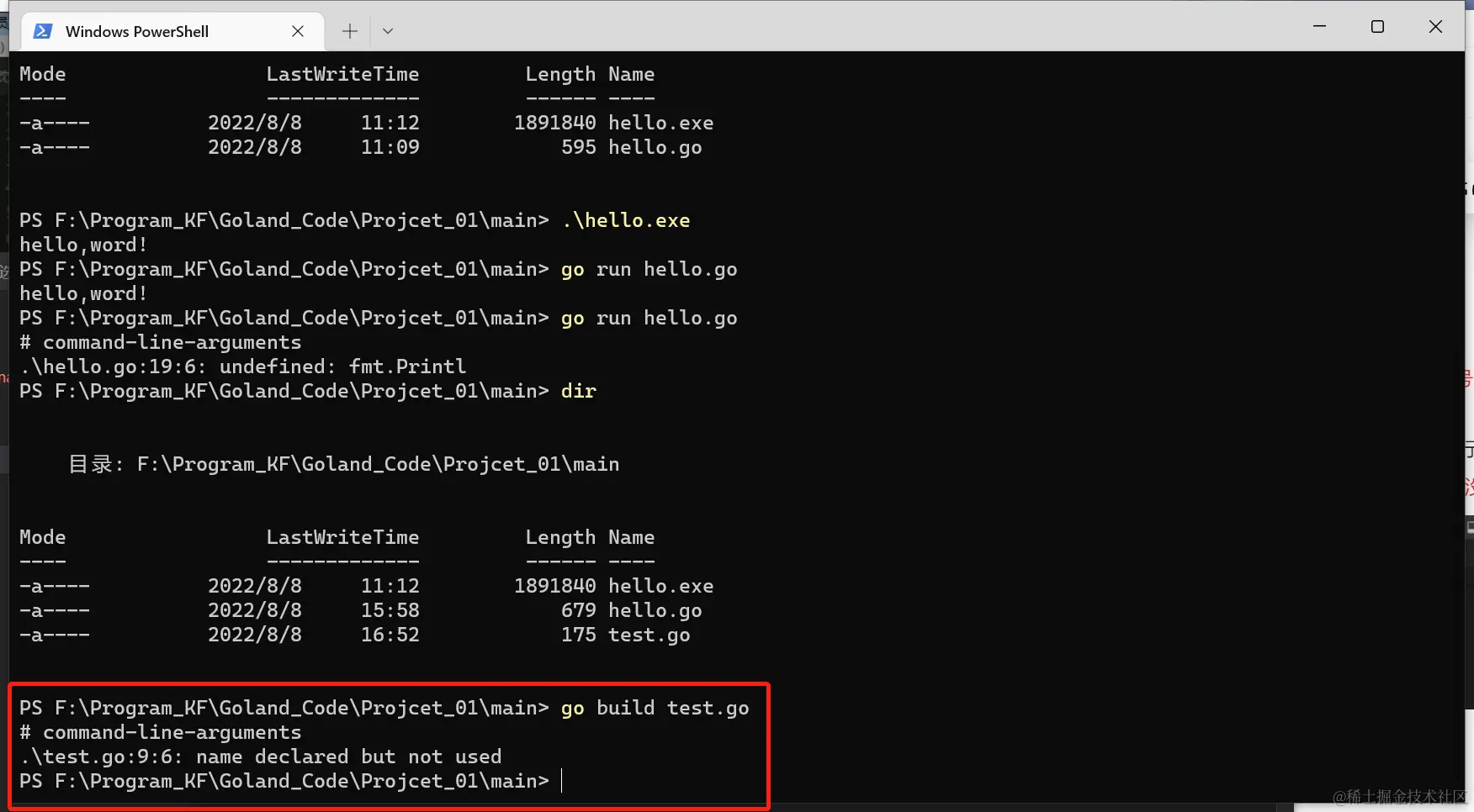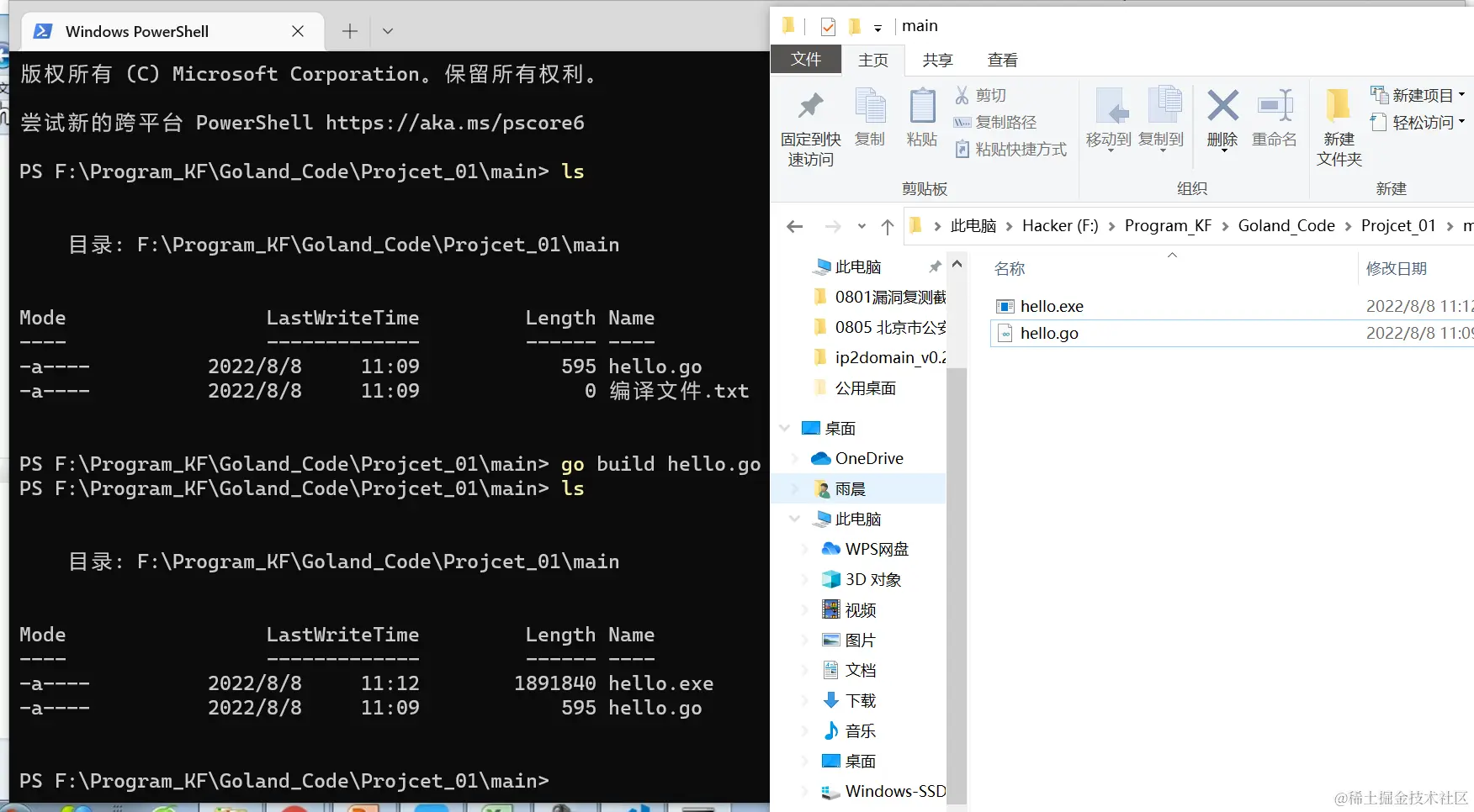 go build对hello.go文件进行编译。可以指定生成的可执行文件名,在Windows下,必须是.exe后缀。go bulid -o myhell.exe hello.go - 如果程序没有错误,没有任何提示,会在当前目录下会出现一个可执行文件(Windows 下是.exe | Linux 下是一个可执行文件),该文件是二进制码文件,也是可以执行的程序。