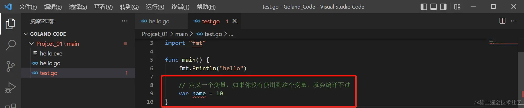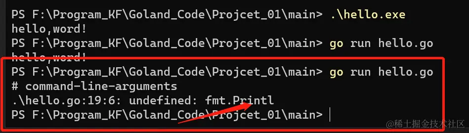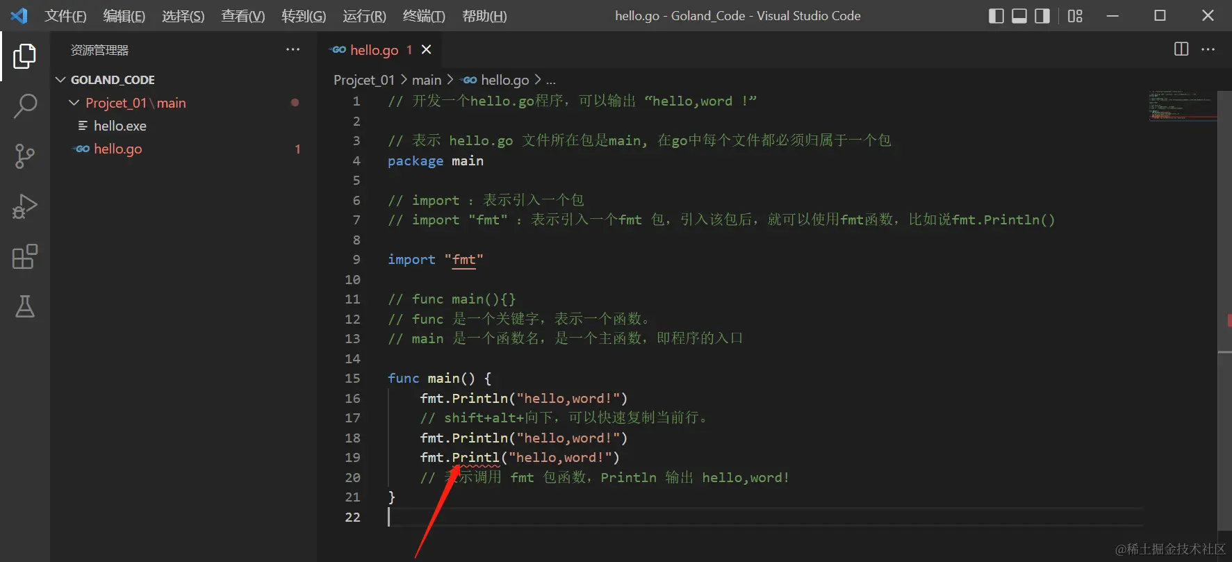 “;”(Go 语言会在每行后自动加分号),这也体现出Goland的简洁性。 - Go 编译器是一行行进行编译的,因此我们一行就写一条语句,不能把多条语句写在同一行,否则会报错。