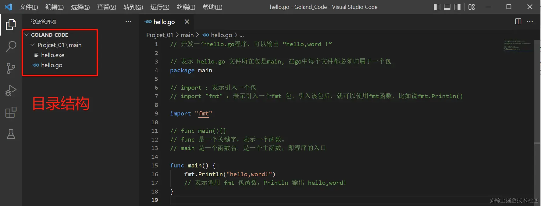 func main()是程序开始执行的函数。main 函数是每一个可执行程序所必须包含的,一般来说都是在启动后第一个执行的函数(如果有 init() 函数则会先执行该函数)。 - 下一行
