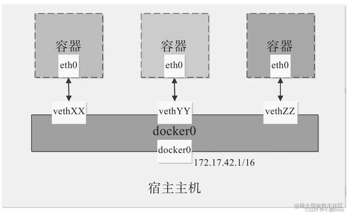 | Docker启动时会在主机上自动创建一个docker0虚拟网桥,实际上是一个Linux网桥,可以理解为一个软件交换机,它会在挂载其上的接口之间进行转发,如下图所示: |