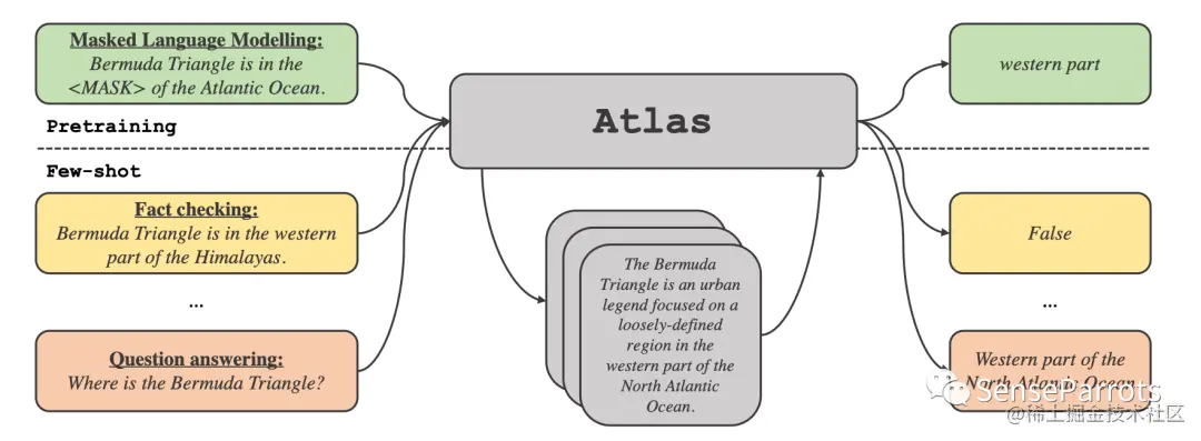 Atlas是一个精心设计和预训练的检索增强语言模型[2],能够用很少的训练示例学习知识密集型任务。Atlas通过使用Contriever双编码器架构的通用密集检索器,基于当前上下文检索相关文档。检索到的文档与当前上下文一起,由序列到序列模型使用融合解码器体系结构进行处理,生成相应的输出。研究者对广泛的任务进行了评估,包括MMLU、KILT和NaturalQuestions,并研究了文档索引内容的影响,表明它可以轻松更新。值得注意的是,Atlas仅使用64个示例就可以在自然问题上达到42%以上的准确率,尽管参数少了50倍,但比540B参数模型高出3%。