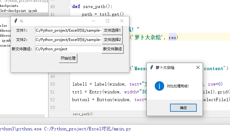 好了,这样我们就完成了一个简易的 GUI 对比 Excel 文件的工具喽