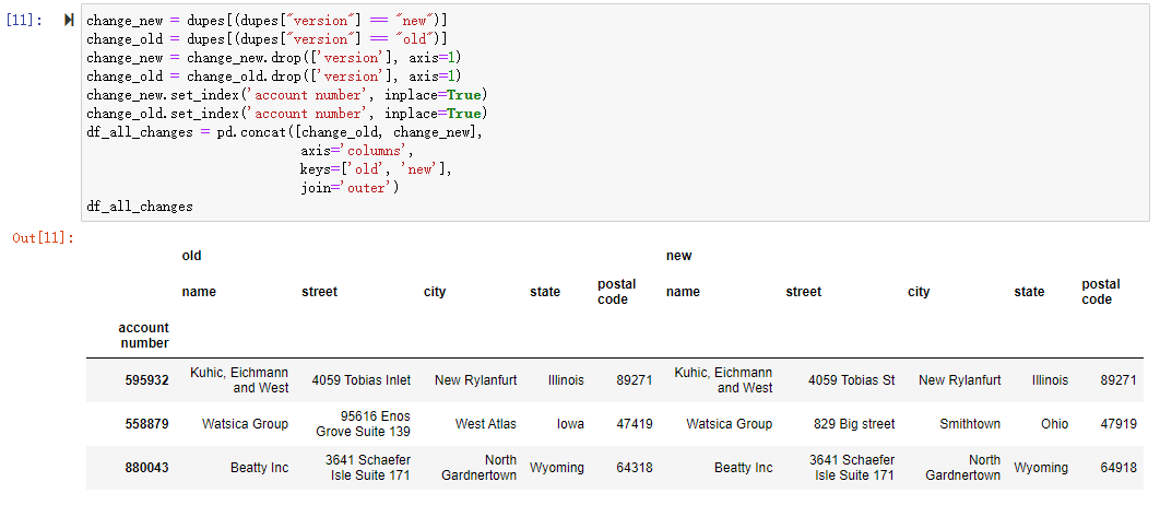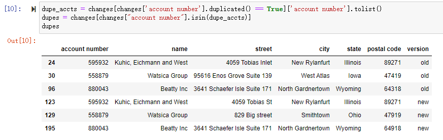 dupes = changes[changes["account number"].isin(dupe_accts)]dupe_accts = changes[changes['account number'].duplicated() == True]['account number'].tolist()dupes = changes[changes["account number"].isin(dupe_accts)]