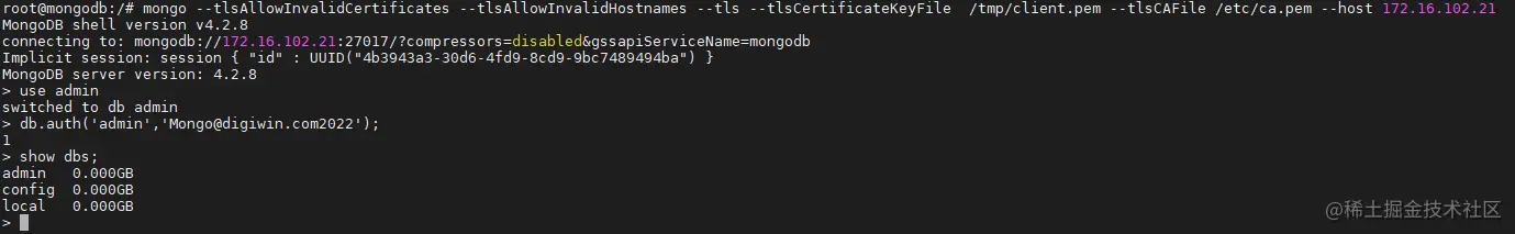 mongo --tlsAllowInvalidCertificates --tlsAllowInvalidHostnames --tls --tlsCertificateKeyFile /etc/server.pem --tlsCAFile /etc/ca.pem --host 172.16.102.21