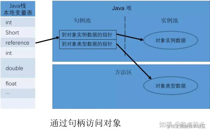 Java 堆中会分配一块内存作为句柄池。reference 存储的是句柄地址,而句柄中包含对象实例数据和类型数据各自的具体地址信息。详情见图。
