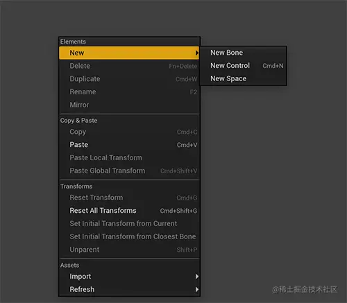 将骨骼树收起,在空白处点击右键,选择 New Control,命名为 Root :