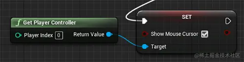由于捏脸场景只有 UI 控制,为了避免鼠标在操作时,切换到场景控制,需要设置 PlayerController 的 Show Mouse Cursor 为 true,可以在关卡蓝图里进行设置: