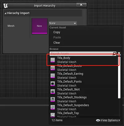 创建后双击打开,在左边点击 Import Hierarchy,在弹窗里点击下拉,选中人体的 Mesh: