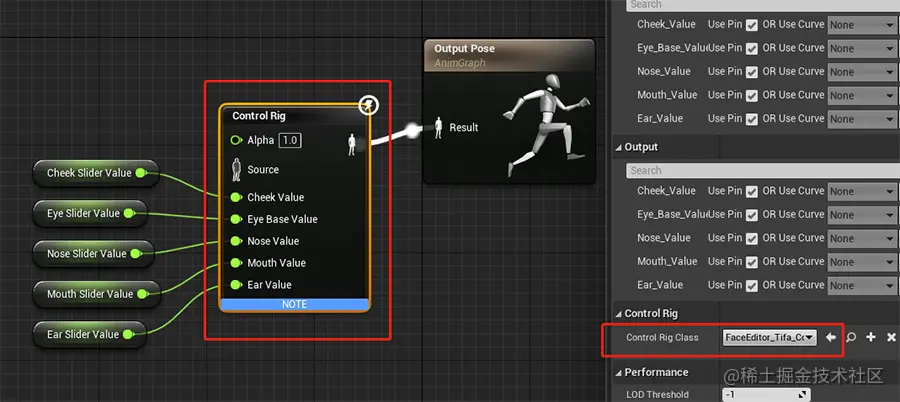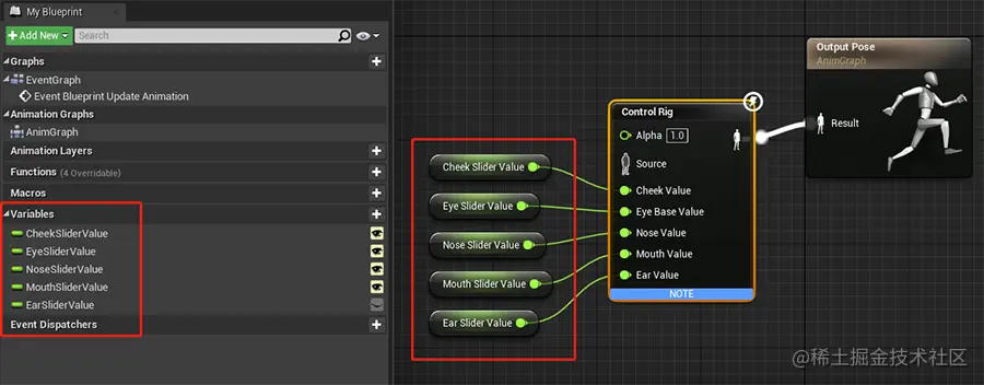 将 Control Rig 的参数向上暴露给动画蓝图,并连接好图表,方便后续在 Event Graph 中修改: