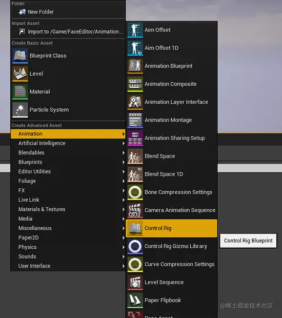 在内容浏览器中,右键 → Animation → Control Rig,选择父类并创建: