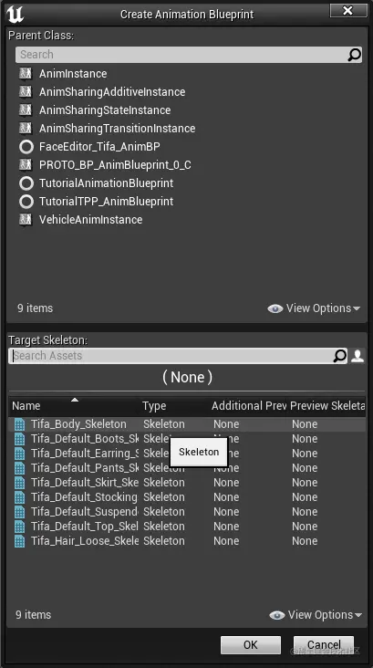 在内容浏览器中,右键 → Animation → Animation Blueprint,在弹窗中选择人体的骨骼: