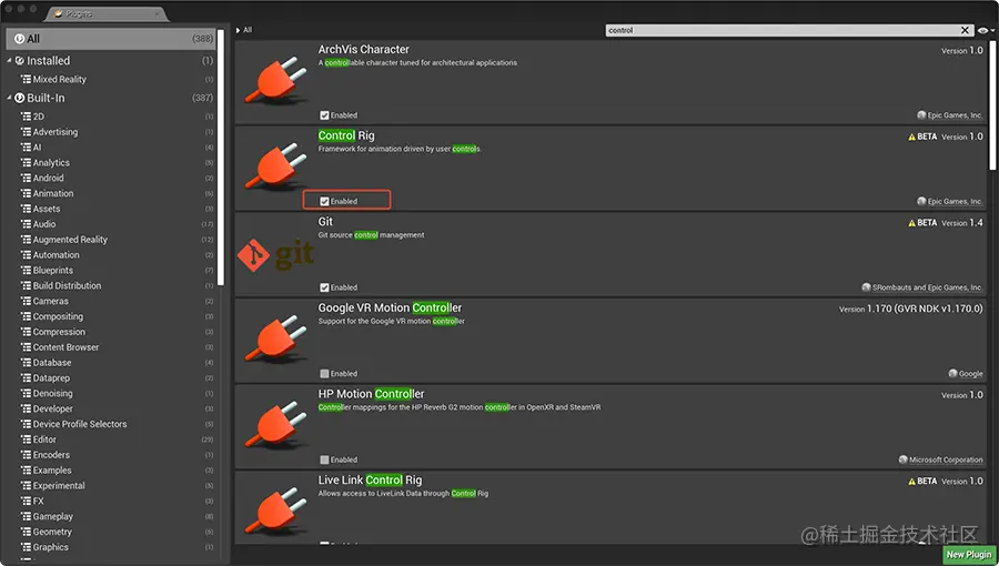 Control Rig 是一套绑定系统,在 UE4 中以插件的形式提供。在插件面板中,搜索 Control Rig,勾选后重启 UE 编辑器: