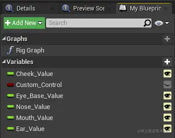 在 My Blueprint 下为 Control Rig 新增参数,参数用于决定 形变的程度,暴露给外部修改: