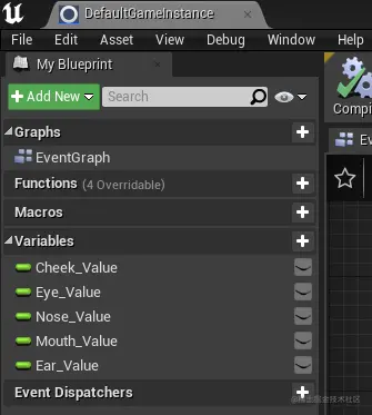 在内容浏览器中,右键 → Blueprint Class → GameInstance,创建 GameInstance 蓝图类,并新增变量: