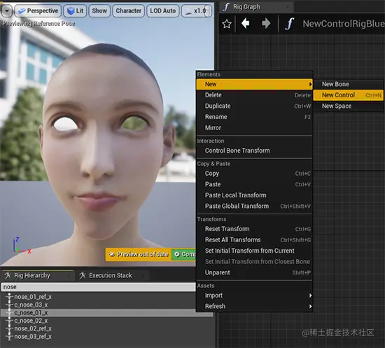 下面以鼻子为例,在骨骼树中搜索 Nose,找到对应骨骼,右键 → New Control: