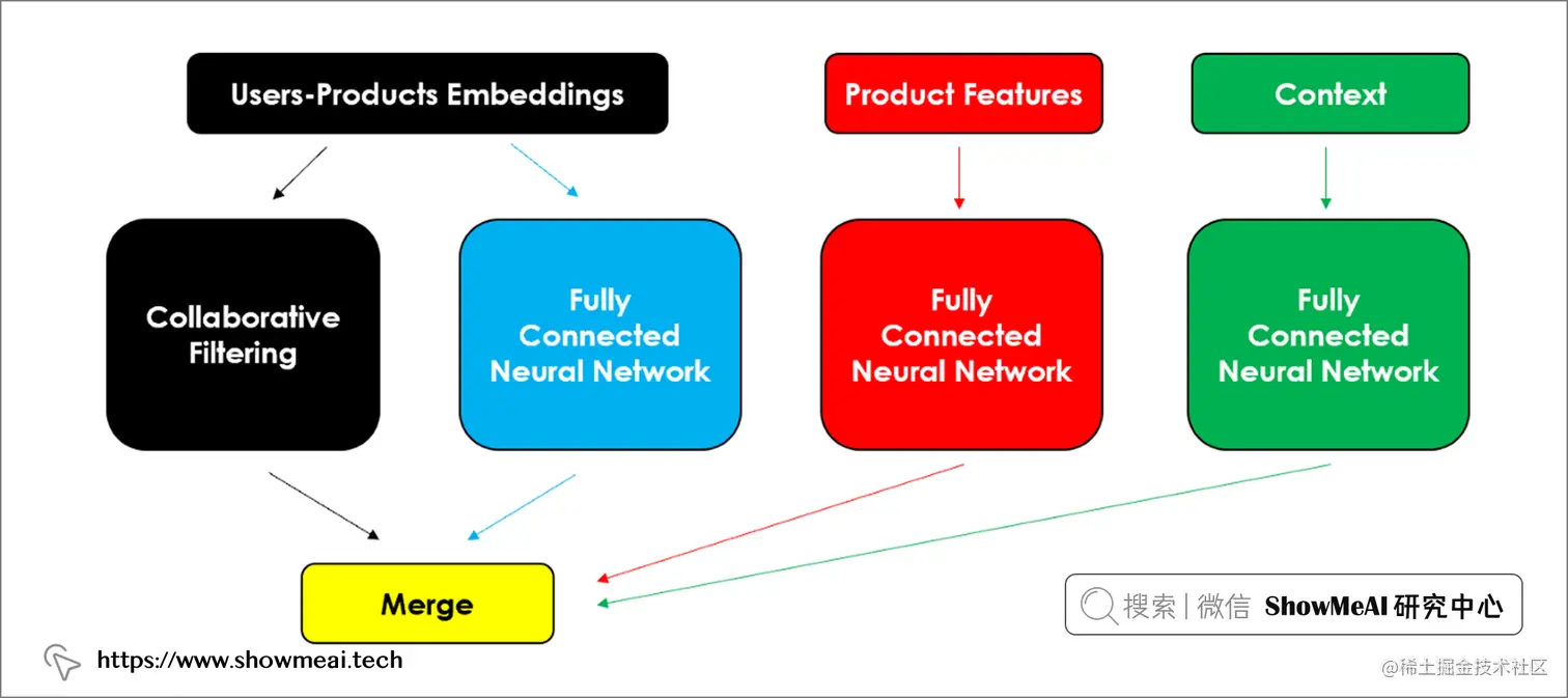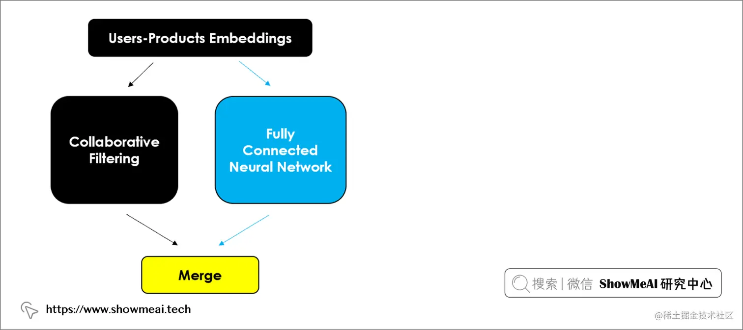 大家在前面看到的协同过滤模型,学习能力相对比较弱,对于我们的信息做的是初步的挖掘,而现代的很多新的推荐系统实际上都使用了深度学习。也可以把深度学习和协同过滤结合,例如 Neural Collaborative Filtering (2017) 结合了来自神经网络的非线性和矩阵分解。该模型旨在充分利用嵌入空间,不仅将其用于传统的协同过滤,还用于完全连接的深度神经网络,新添加的模型组成部分会捕获矩阵分解可能遗漏的模式和特征,如下图所示: