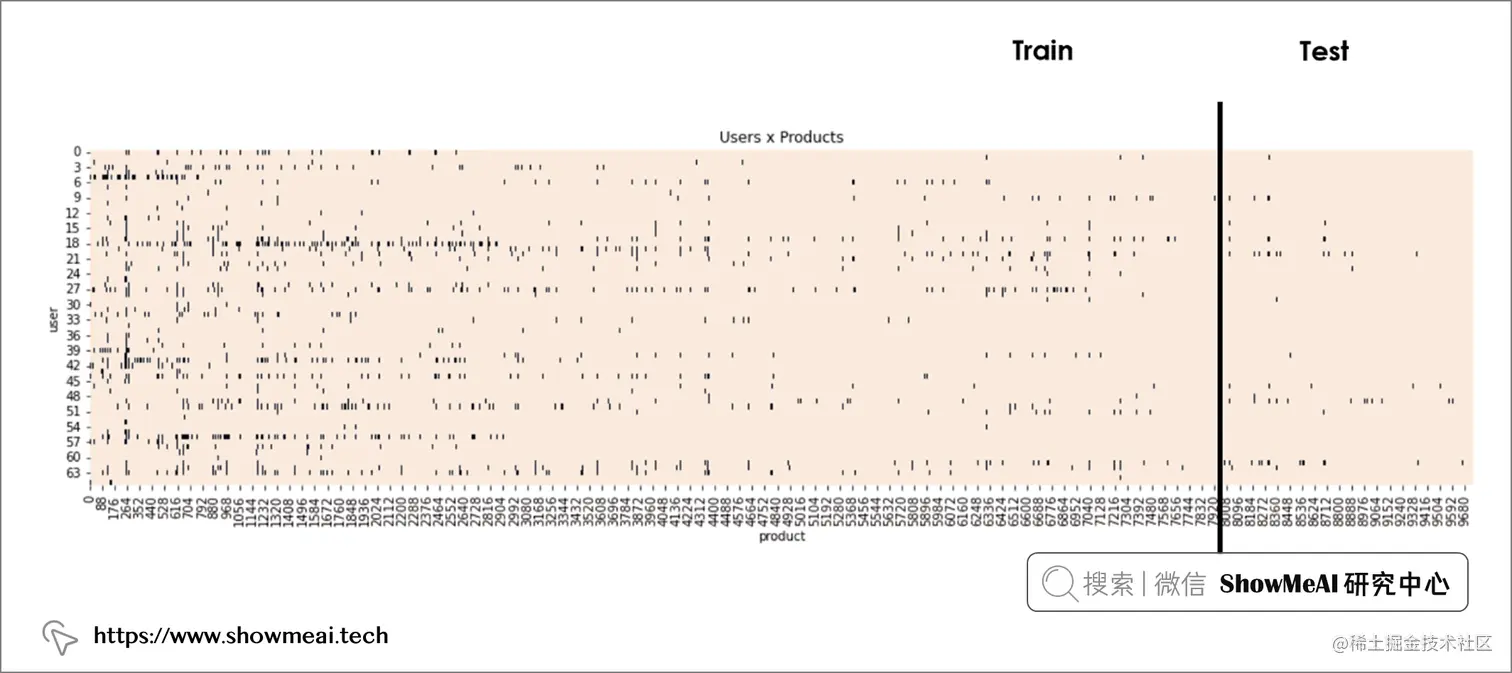 简单处理完数据之后,就像任何典型的机器学习任务一样,我们需要对数据进行划分,在这里划分为训练集和测试集。如果结合上述『用户-电影』矩阵,我们会做类似下图的垂直切分,这样训练集和测试集都会尽量覆盖所有用户: