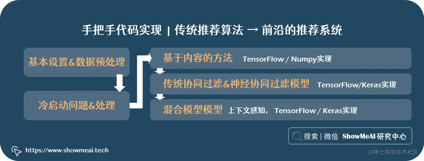 在本篇内容中,ShowMeAI 将给大家一一道来,从传统推荐系统算法到前沿的新式推荐系统,讲解原理并手把手教大家如何用代码实现。