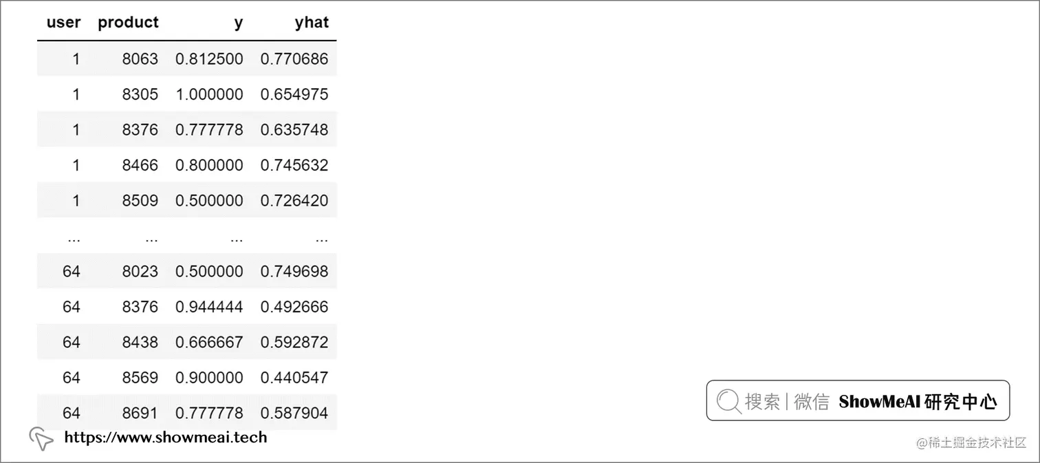 在这个模型最终的预估结果上,大家可以看到模型已经能够对没有见过的新的电影进行打分的预测了。我们可以基于这个得分进行排序和完成最终的推荐。以我们第1个用户为例,我们可以看到对于他进行基于预测得分的推荐,评估结果如下。