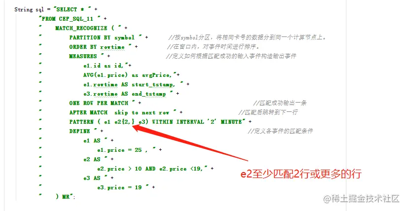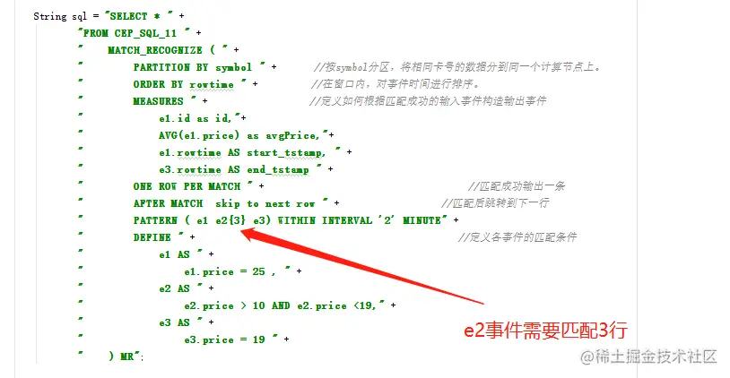 " PATTERN ( e1 e2* e3) WITHIN INTERVAL '2' MINUTE" +