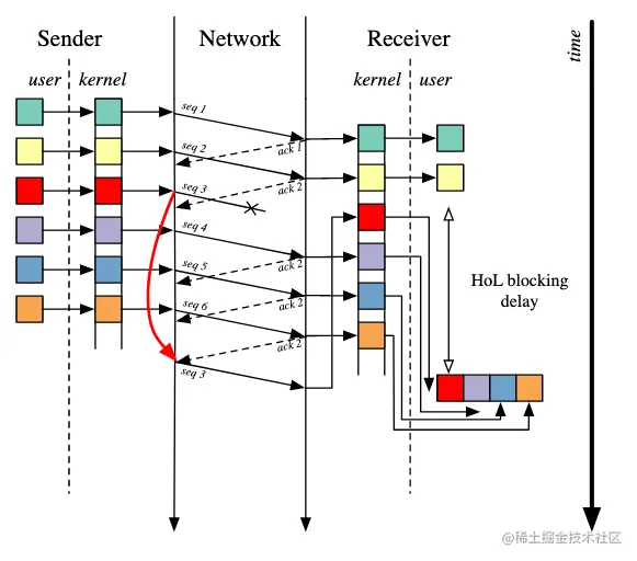 PS:TCP为了保证可靠传输,有个特别的“丢包重传”机制,即丢失的包必须要等待重新传输确认,其他的包即使已经收到了,也只能放在缓冲区(kernel)里,上层的应用(user)拿不出来,可参考下图:红色方块请求是阻塞TCP的关键。