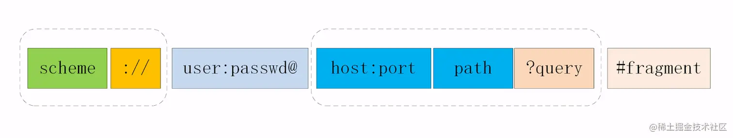 #fragment:它代表一个片段标识,我们可以理解为资源内的一个锚,它是给客户端使用的,不会发送给服务器。平时我们在看一些博客时(如阅读原文跳转到我的博客网页),点击悬浮目录中的某个标题做跳转,就是用的这个部分。