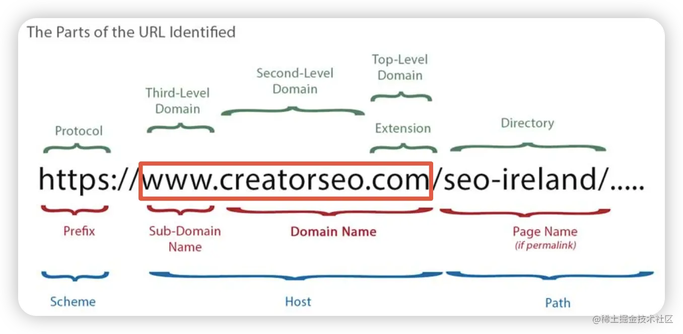 我们先来看看域名的结构,还是这张图,这里红框部分就是域名,它是一个有层次的结构,用.分隔,越靠右边,层级越高。如从右到左,分别为顶级域名、二级域名、三级域名等等。