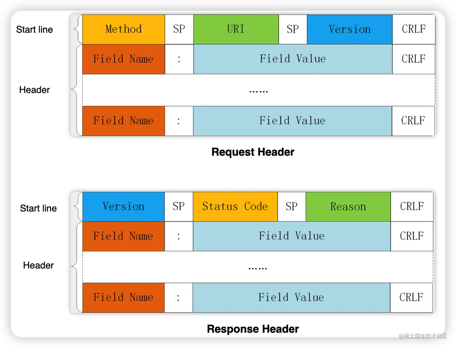 1)头部:一般可以包含起始行部分,也就是头部由Start line和Header组成。下图展示了一次请求中,请求头和返回头的结构: