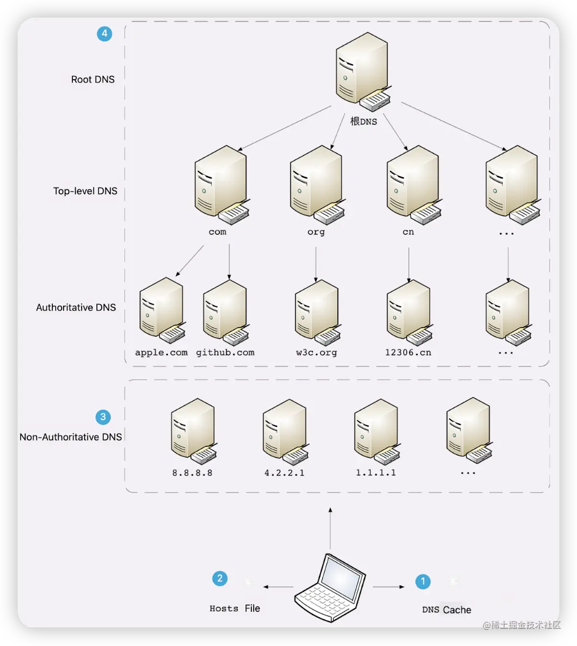 1)DNS类型。DNS分为根DNS、顶级DNS、权威DNS和非权威DNS。根DNS共有13组,遍布全球,它可以根据请求的顶级域名将DNS解析指定给下面对应的顶级DNS。顶级DNS又根据二级域名指定权威DNS,直到解析出域名对应的IP。而一些大公司还会自建DNS,又叫非权威DNS,它们的分布更广,比较知名的有Google的8.8.8.8,Microsoft的4.2.2.1,还有CloudFlare的1.1.1.1等等。