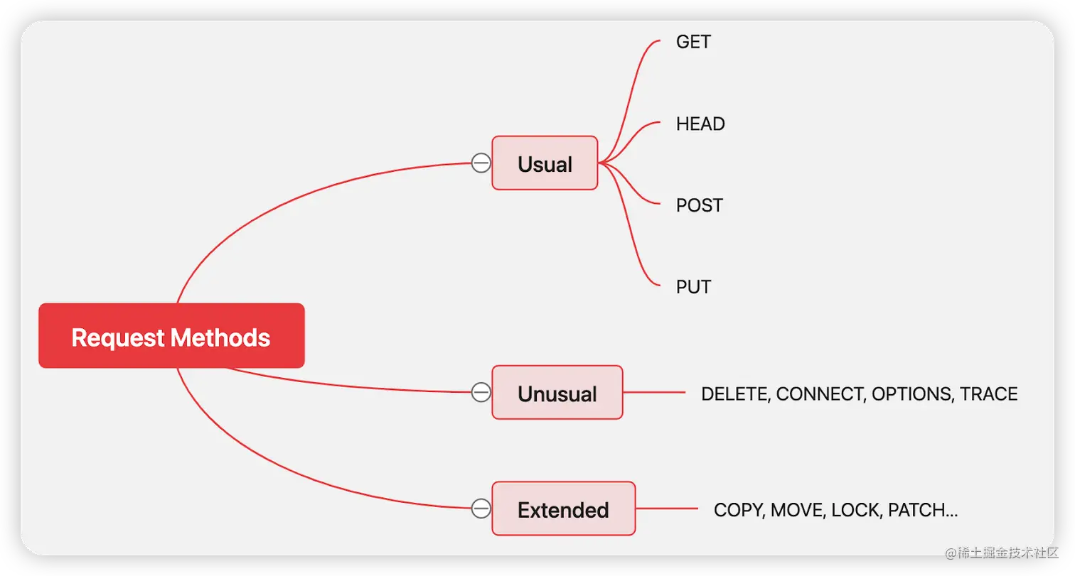 1. +Request way: HEAD, POST. 2. +Data: img, audio. 3. +Other: HTTP Head, status code, protocol version.