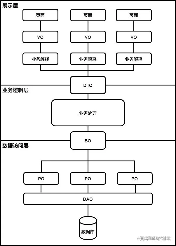 为什么BO也画成横跨两层呢?原因是现在很多持久层框架自身就提供了数据组合的功能,因此BO有可能是在业务层由业务来拼装PO而成,也有可能是在数据库访问层由框架直接生成
