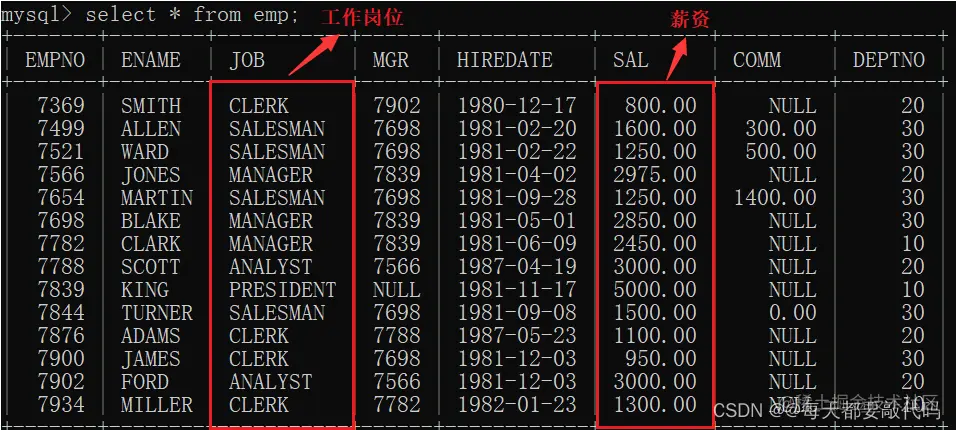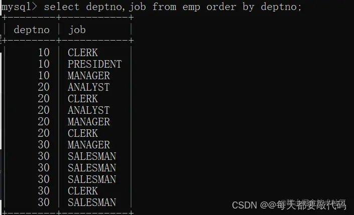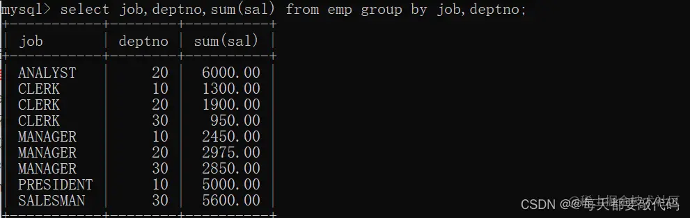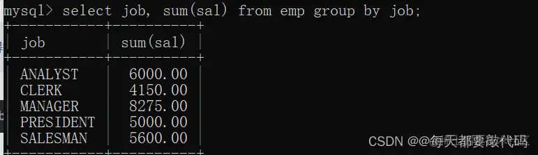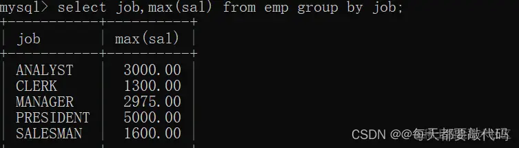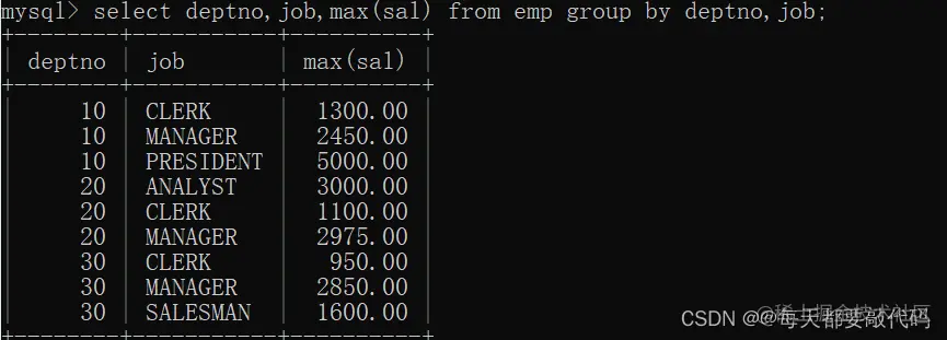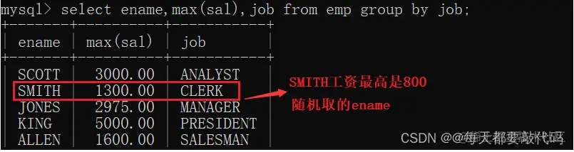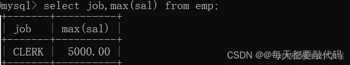 我们在加上名字ename字段:select ename,max(sal),job from emp group by job;以上在mysql当中,查询结果是有的,但是结果没有意义,在Oracle数据库当中会报错,语法错误。Oracle的语法规则比MySQL语法规则严谨。