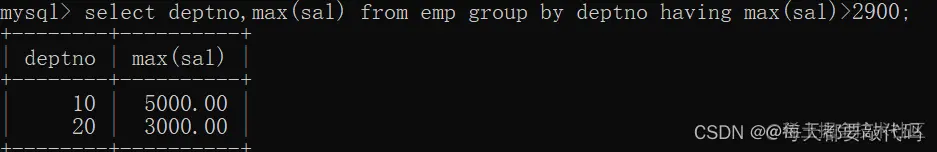 (1)找出每个部门的最高薪资,要求显示薪资大于2900的数据。【having 和 where 都可】