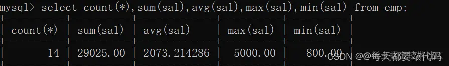 select count(*),sum(sal),avg(sal),max(sal),min(sal) from emp;