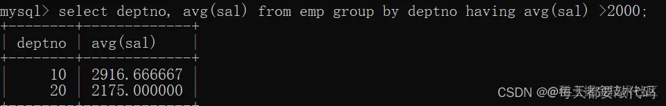(2)找出每个部门的平均薪资,要求显示薪资大于2000的数据【只能使用having】