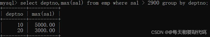 select deptno,max(sal) from emp where sal > 2900 group by deptno;