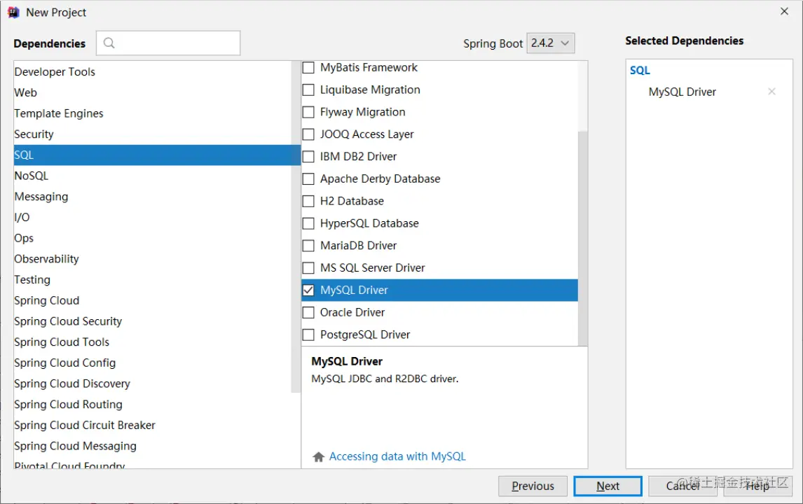 - 选择当前模块需要使用的技术集(仅保留JDBC)