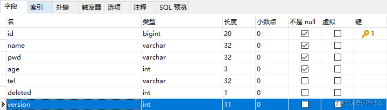 SELECT id,name,age,tel,deleted,version FROM tbl_user WHERE id=?