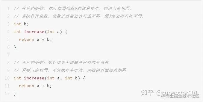 再具体到编程实现,函数式编程跟面向过程编程一样,也是以函数作为组织代码的单元。不过,它跟面向过程编程的区别在于,它的函数是无状态的。何为无状态?简单点讲就是,函数内部涉及的变量都是局部变量,不会像面向对象编程那样,共享类成员变量,也不会像面向过程编程那样,共享全局变量。函数的执行结果只与入参有关,跟其他任何外部变量无关。同样的入参,不管怎么执行,得到的结果都是一样的。这实际上就是数学函数或数学表达式的基本要求。举个例子: