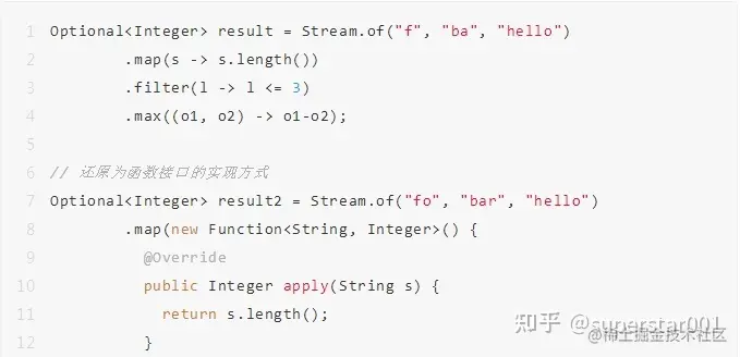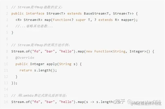 下面三段代码,第一段代码展示了map函数的定义,实际上,map函数接收的参数是一个Function接口,也就是函数接口。第二段代码展示了map函数的使用方式。第三段代码是针对第二段代码用Lambda表达式简化之后的写法。实际上,Lambda表达式在Java中只是一个语法糖而已,底层是基于函数接口来实现的,也就是第二段代码展示的写法。