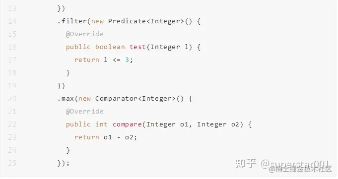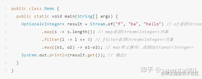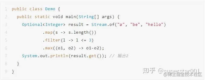 再来看之前的例子,对代码做了注释解释。其中map、filter是中间操作,返回Stream类对象,可以继续级联其他操作;max是终止操作,返回的不是Stream类对象,无法再继续往下级联处理了。