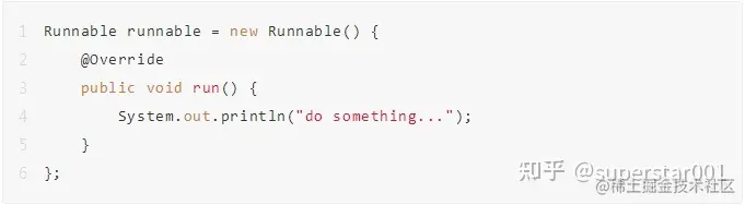 在很长的一段时间里,Java一直是面向对象的语言,一切皆对象,如果想要调用一个函数,函数必须属于一个类或对象,然后在使用类或对象进行调用。但是在其它的编程语言中,如JS、C++,我们可以直接写一个函数,然后在需要的时候进行调用,既可以说是面向对象编程,也可以说是函数式编程。从功能上来看,面向对象编程没什么不好的地方,但是从开发的角度来看,面向对象编程会多写很多可能是重复的代码行。比如创建一个Runnable的匿名类的时候: