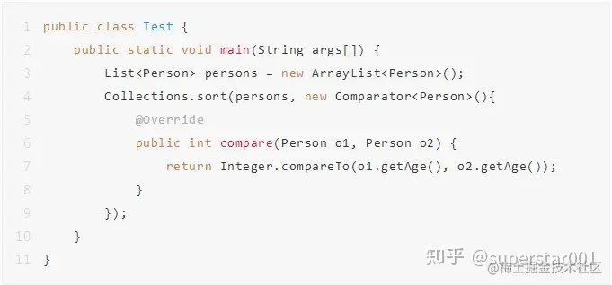 - 规规矩矩的写一个实现了Comparator接口的Java类去封装排序逻辑。若业务需要多种排序方式,那就得写多个类提供多种实现,而这些实现往往只需使用一次。