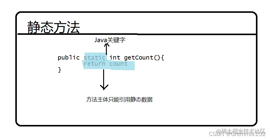 由于静态方法不在特定对象的上下文中操作,所以静态方法不能引用类实力的实例变量。如果静态方法尝试使用非静态变量,编译器就会报错,因为静态变量的存在与具体对象无关,所以静态方法可以引用静态变量。所有静态方法(包括main方法)只能放稳静态变量或者局部变量。关于这一点,有些晦涩难懂,下面我们把它单独拉出来谈谈。