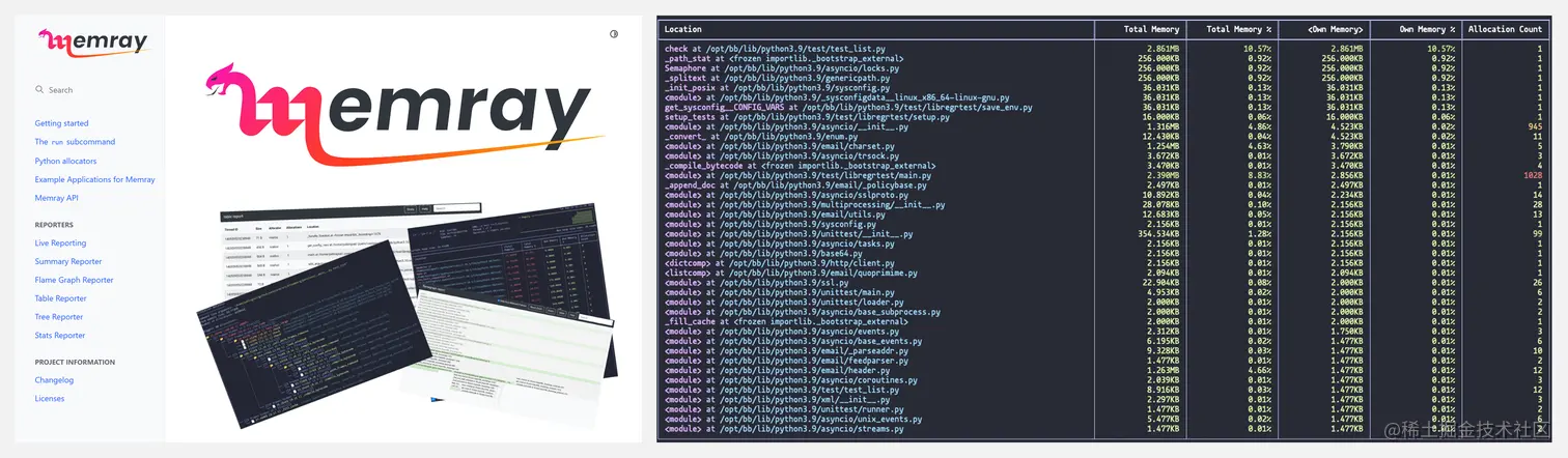 Memray是一个Python的内存分析器。它可以跟踪Python代码、本地扩展模块和Python解释器本身的内存分配情况。它可以生成几种不同类型的报告,帮助你分析捕获的内存使用数据。它既可以作为CLI工具使用,也可以作为一个库来执行更细化的剖析任务。Memray可以在这些场景中发挥大作用:「分析应用程序中的分配,帮助发现高内存使用率的原因」、「寻找内存泄漏」、「找到代码中导致大量分配的核心点」。
