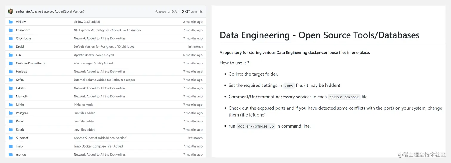 Data Engineering 是一个工具集合,把测试数据工程工具、数据库和开放源码库整合梳理后构建为 docker-compose 文件,方便随时启动包含上述工具功能的环境。