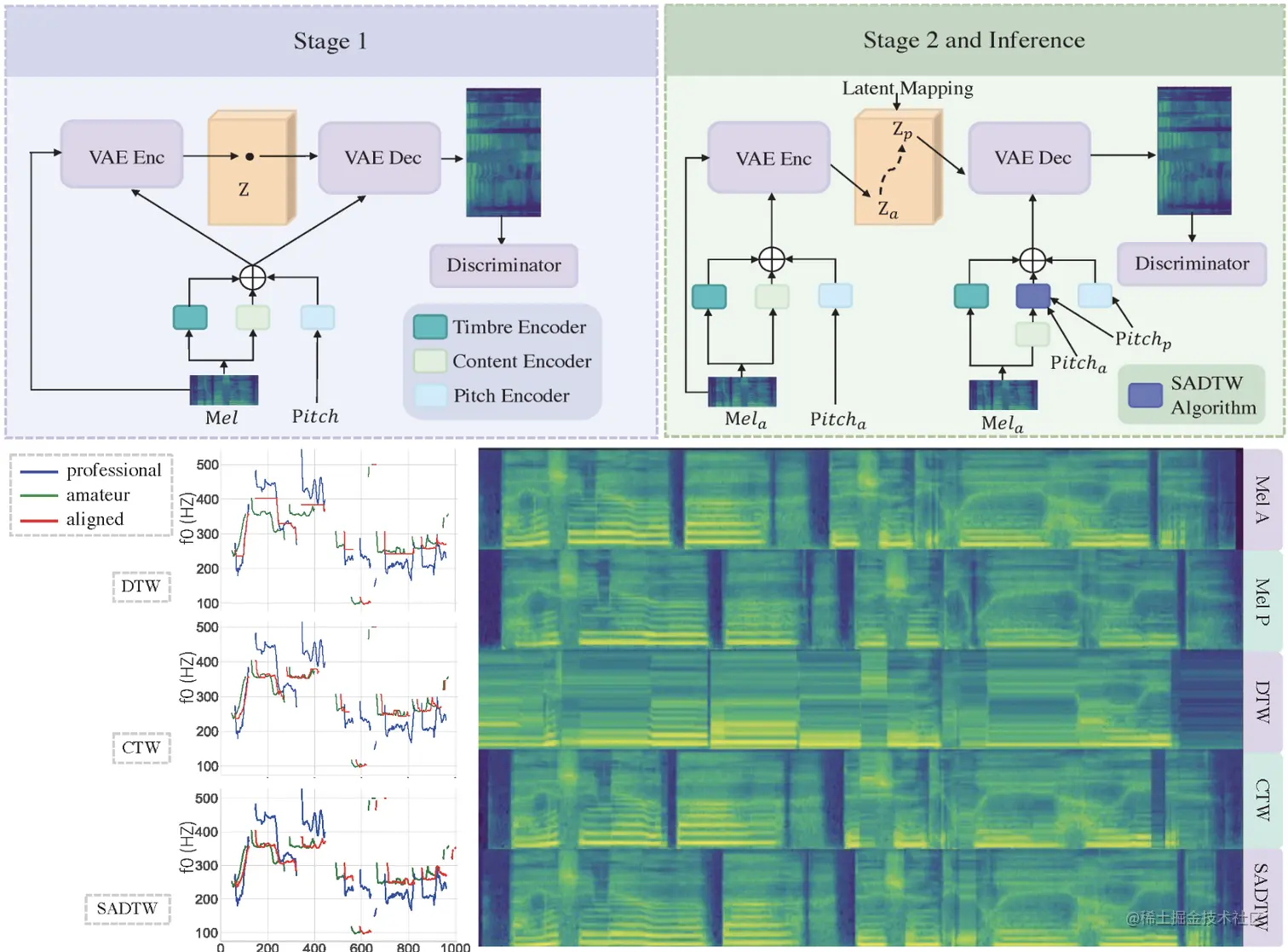 论文摘要:我们对一项新的任务--歌声美化(SVB)感兴趣。考虑到一个业余歌手的歌声,SVB的目的是改善声音的音调和声调,同时保留内容和声音的音色。目前的自动音调校正技术还不成熟,而且大多数只限于音调,而忽略了整体的美学质量。因此,我们引入了神经唱腔美化器(NSVB),这是第一个解决SVB任务的生成模型,它采用了条件变异自动编码器作为骨干,并学习了声调的潜在表示。在NSVB中,我们提出了一种新的时间扭曲方法来进行音调校正。形状感知动态时间扭曲(SADTW),它改善了现有时间扭曲方法的稳健性,使业余录音与模板音高曲线同步。此外,我们还提出了一种潜伏空间的潜伏映射算法,将业余的声调转换为专业的声调。为了实现这一目标,我们还提出了一个新的数据集,其中包含业余和专业版本的平行歌唱录音。在中文和英文歌曲上的广泛实验表明,我们的方法在客观和主观指标上都很有效。音频样本可在 neuralsvb.github.io 获取,代码地址:github.com/MoonInTheRi…