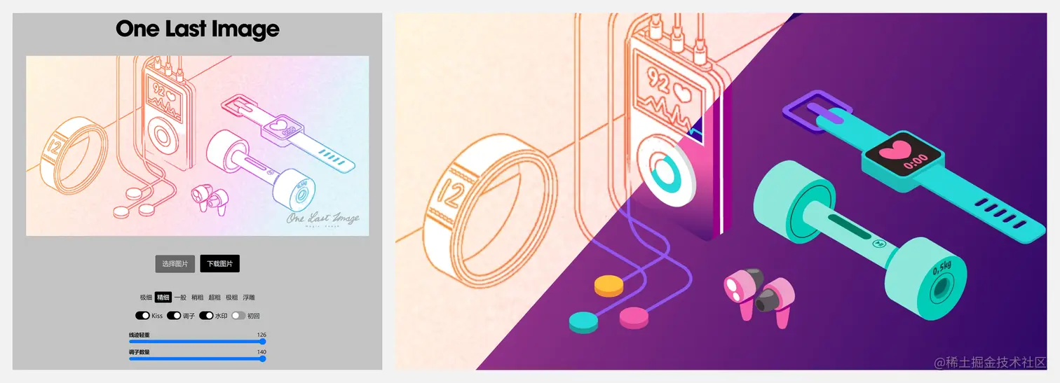 【One Last Image/卢浮宫生成器】是一个将赛璐珞风格动画截图或插画,转换成 One Last Kiss 封面风格的在线生成器。可以自定义很多细节参数,包括「线条处理方案」、「开关 One Last Kiss 风格」、「给画面暗部排铅笔调子」、「线迹轻重」、「调子数量」等,支持点按图片和原图对比生成效果,也可以直接输出对比图。