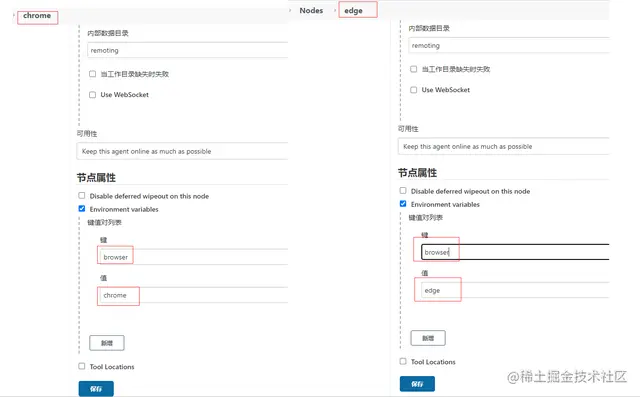 其他配置同上,但需要在节点属性中添加相同的名字但值不同的环境变量,在构建命令中使用,达到执行不同浏览器的目的。