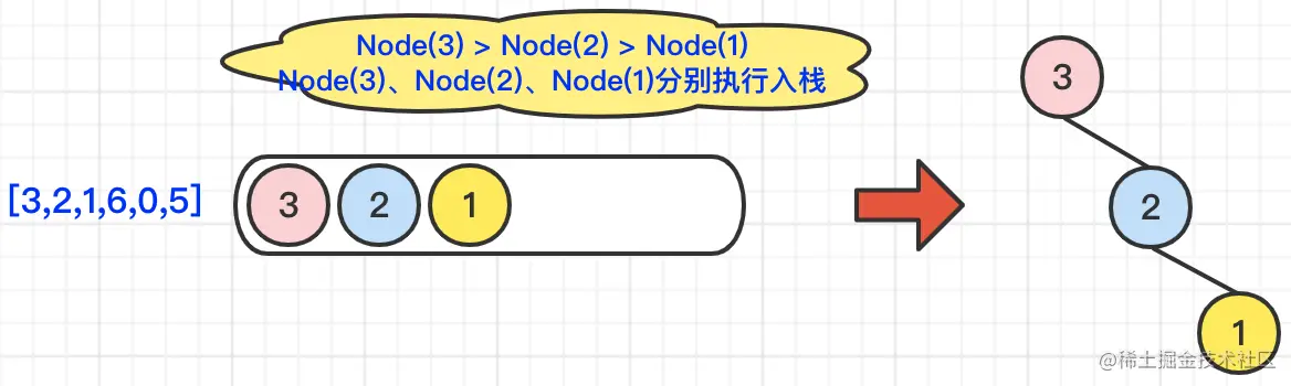 2> 如果栈顶元素小于待插入的元素,则:待插入元素.left = 栈顶元素。